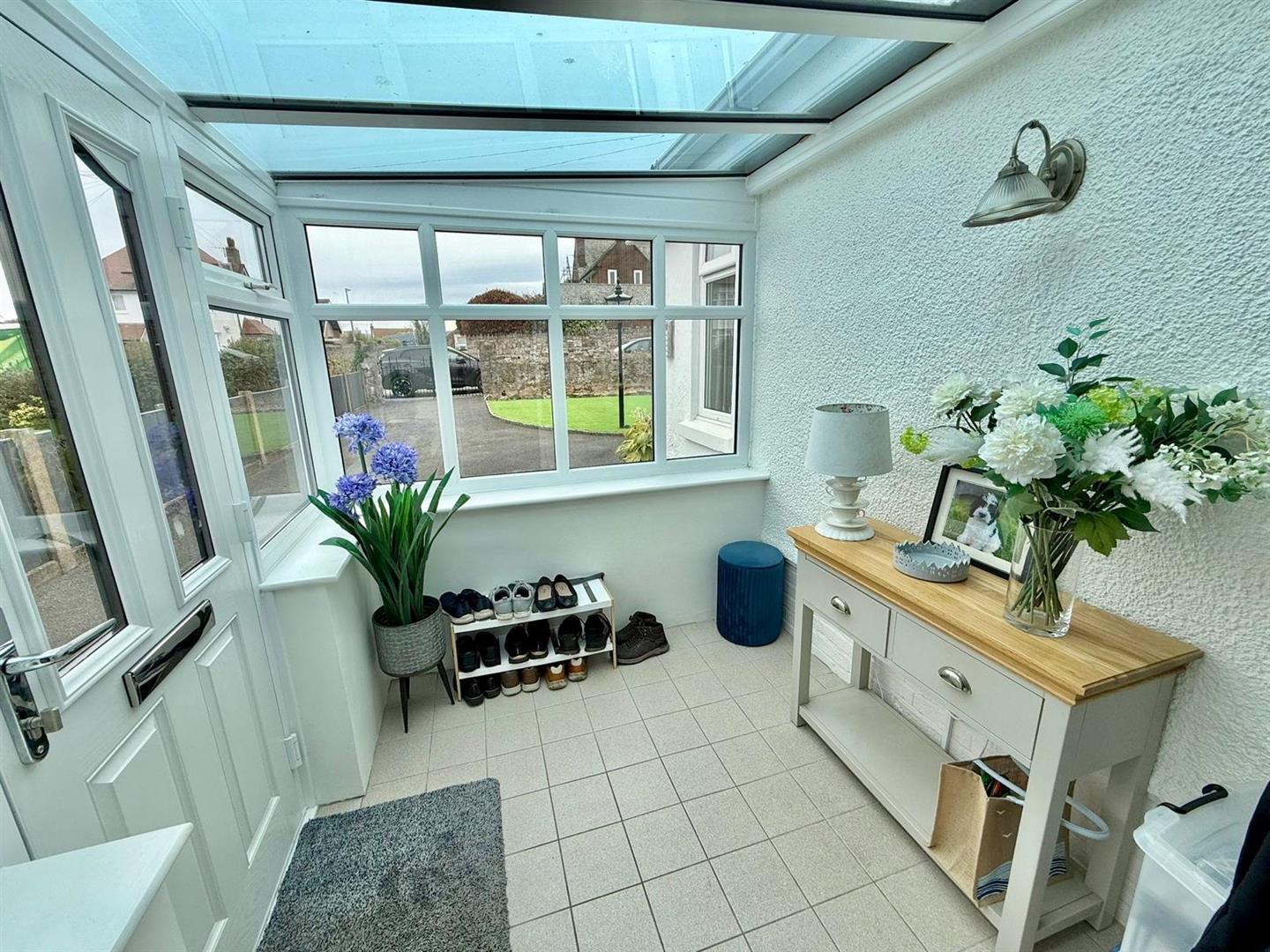 Tiled flooring; Cloak hooks; UPVC double glazed door leading to: