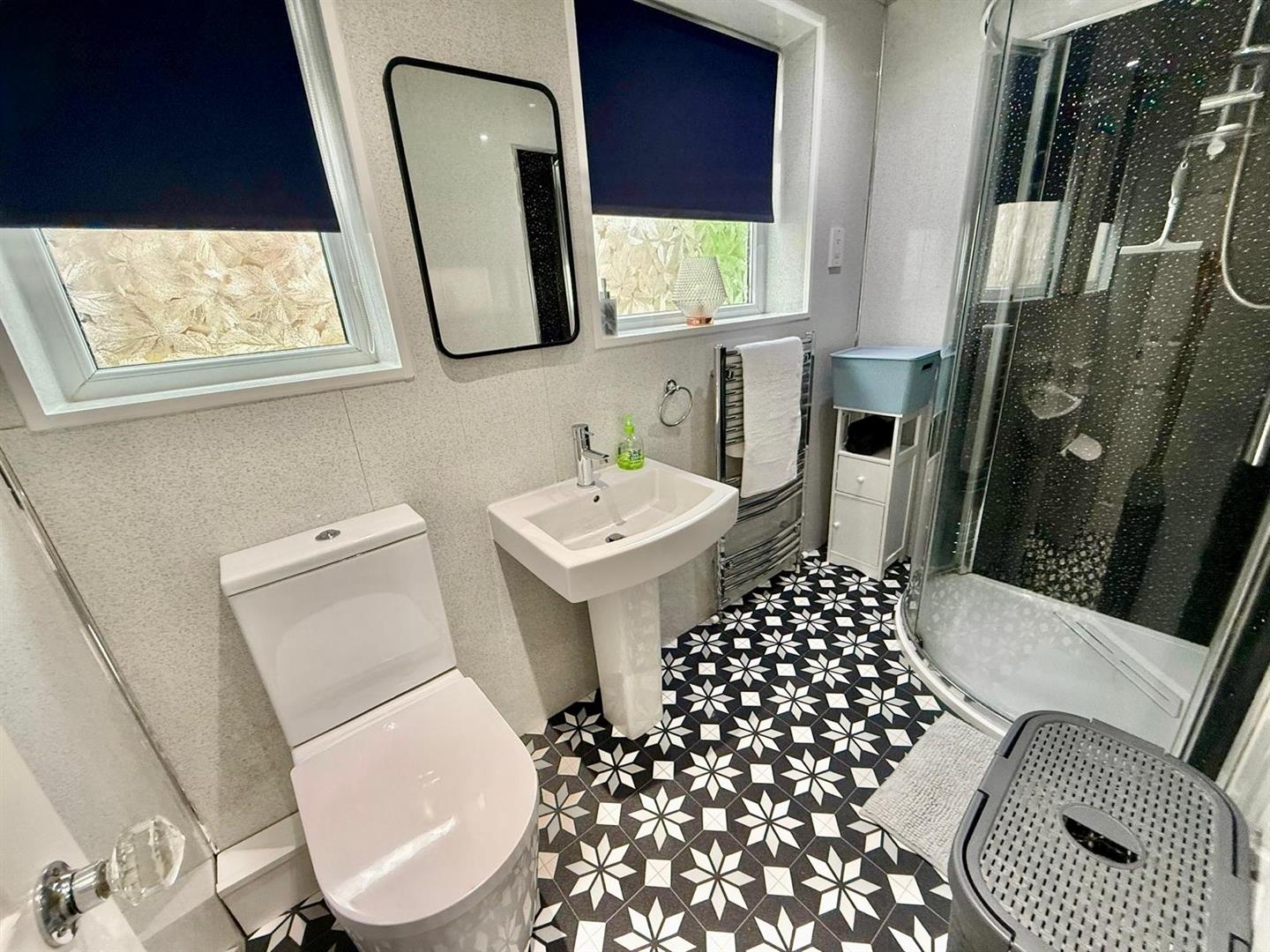 Fitted with corner shower unit with shower fitment above; low flush w.c.; wash hand basin; 2 Upvc double glazed windows; inset spotlighting.