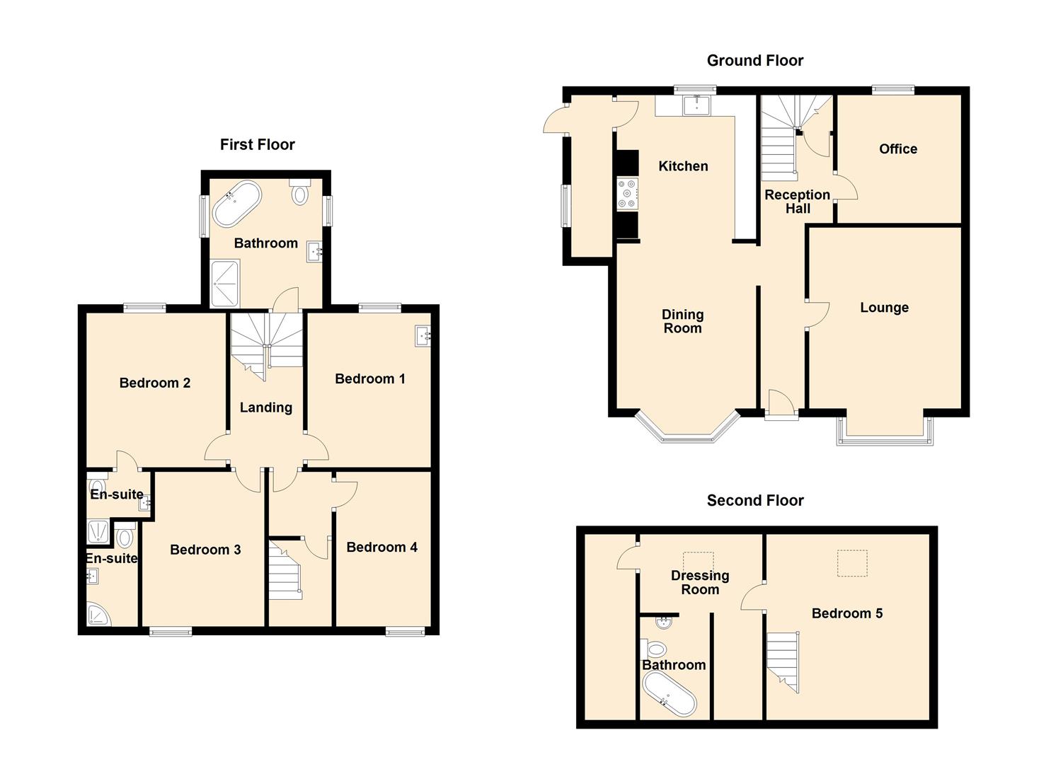 Comprising Entrance Hallway, two bright reception rooms each with charming stone fireplaces, rear snug/office, kitchen with fitted units and timber worktops, utility room. Five bedrooms, two of which benefit from en-suite facilities including handwash basin and one of which is an attic bedroom suite with dressing area and en-suite bathroom. Spacious family bathroom with a freestanding roll-top bath, walk-in shower, and stylish finishes throughout.