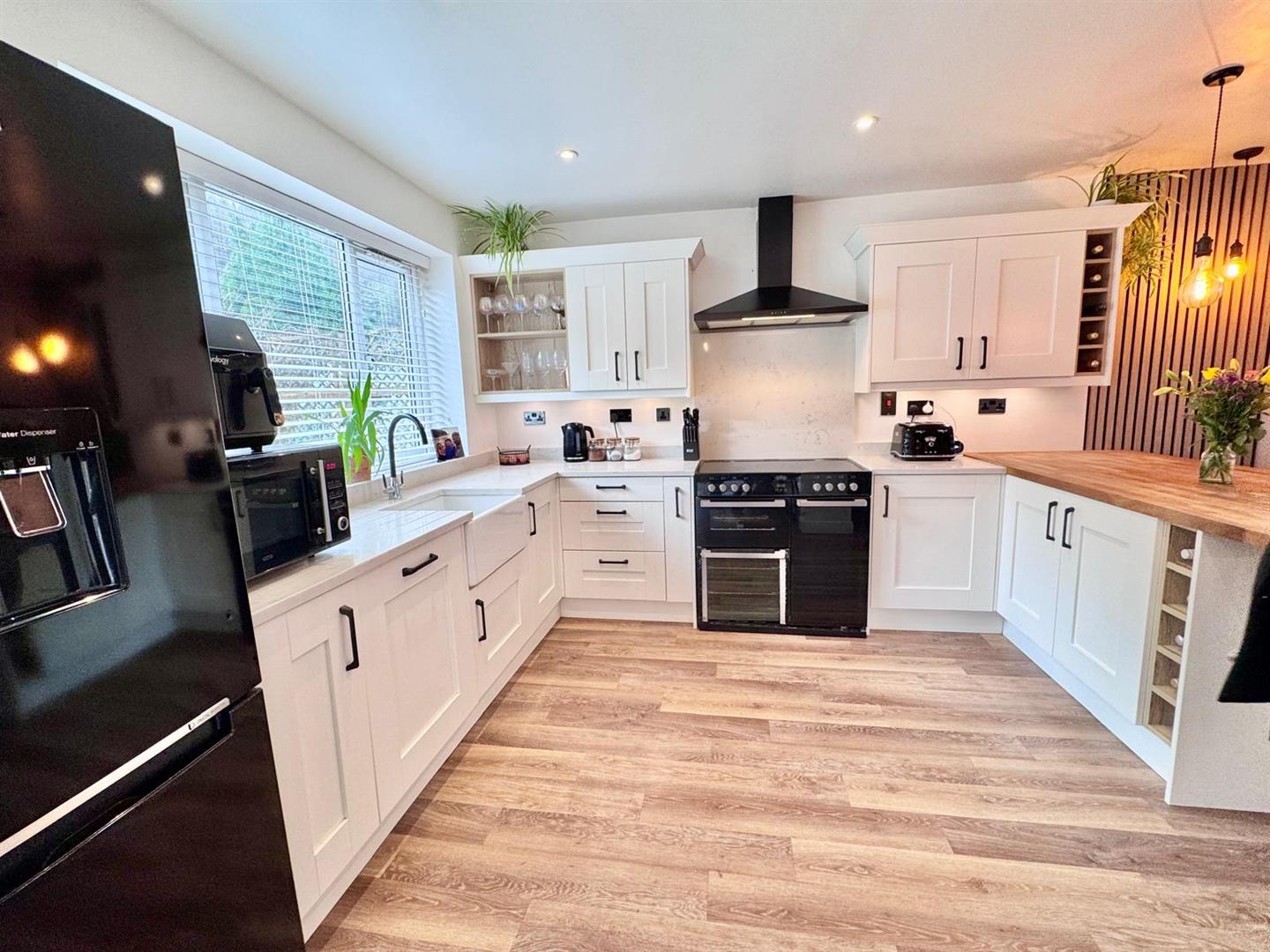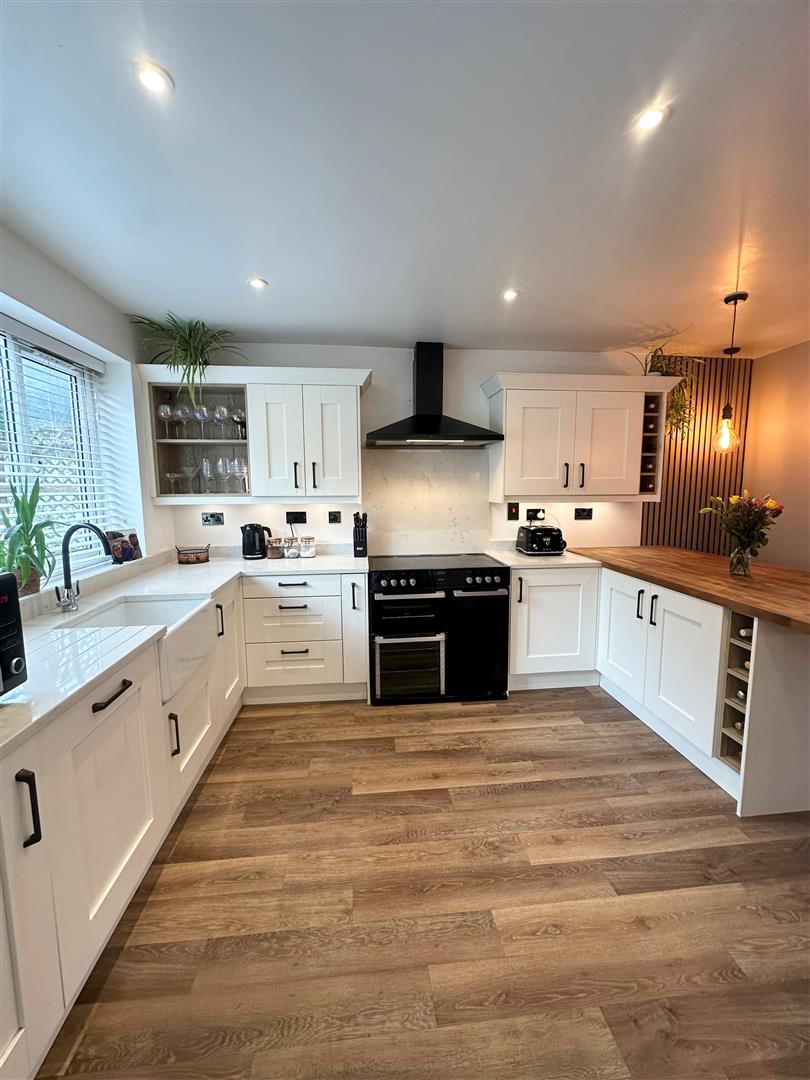 Kitchen has a range of modern base and wall units with quartz worktops, inset porcelain Belfast style sink, range cooker with extractor hood above, solid timber worktop over breakfast bar, integrated dishwasher, space for fridge/freezer, uPVC double glazed window overlooking rear.
