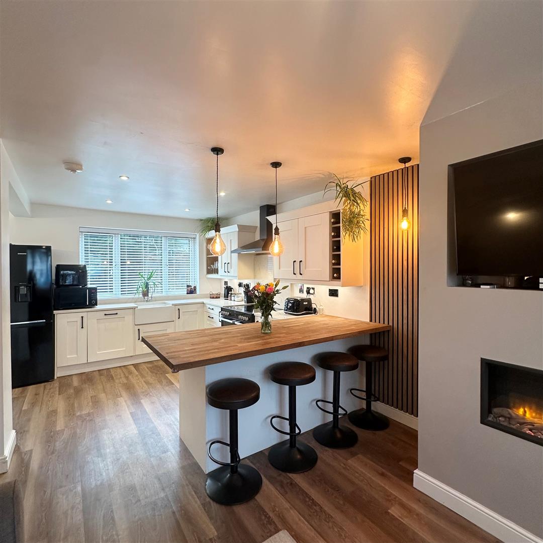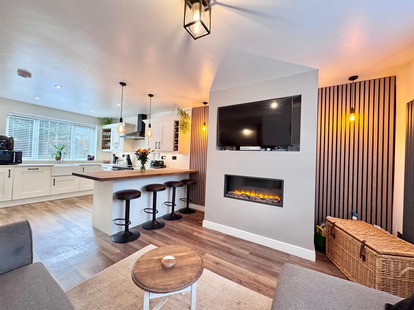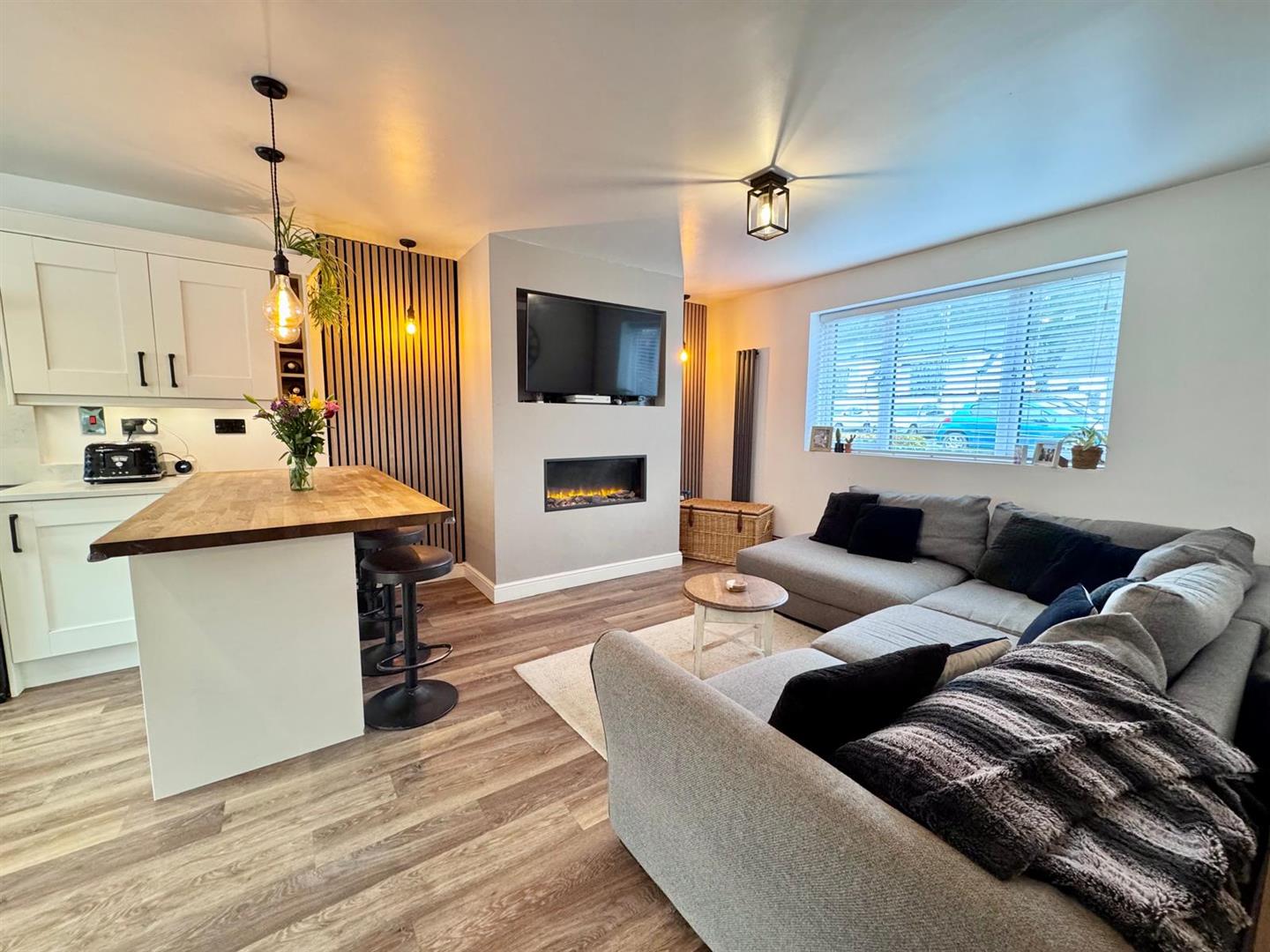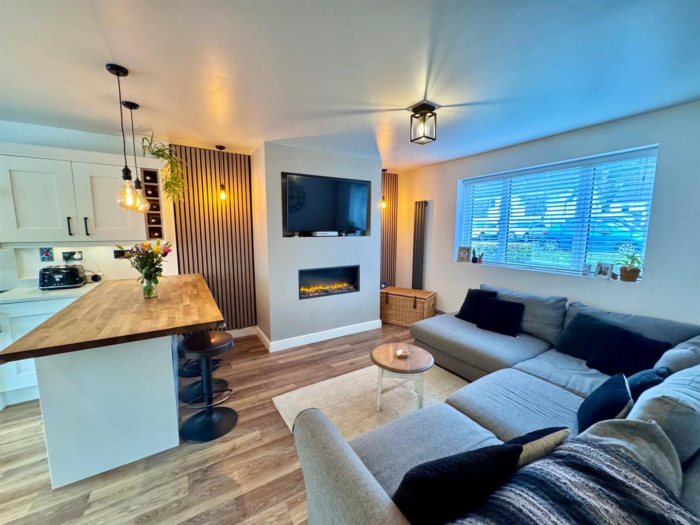 Lounge with feature media wall with inset electric fire, TV point above, uPVC double glazed window overlooking front enjoying open views, column radiator. Peninsular base units and breakfast bar sub dividing from Kitchen.