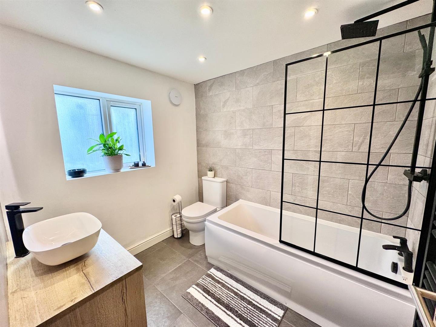 Three piece modern suite comprising; panelled bath with shower above, glazed shower screen, vanity washbasin with mirror and light above, low level w.c. wall and floor tiling, ladder style heated towel rail, Xplair fan.