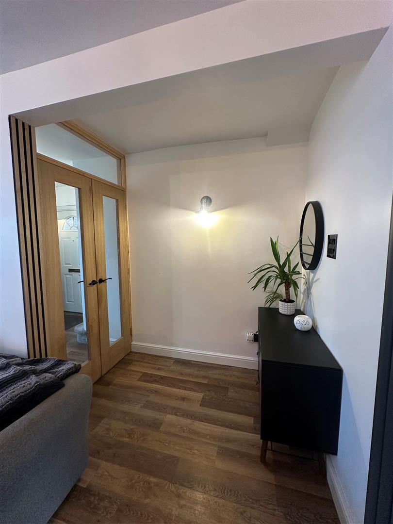 Composite double glazed front door, uPVC double glazed window, staircase leading off to first floor level, telephone point, built in gas/electric meter cupboard, twin oak and glazed doors leading through to open plan Lounge/Kitchen/Dining Room.