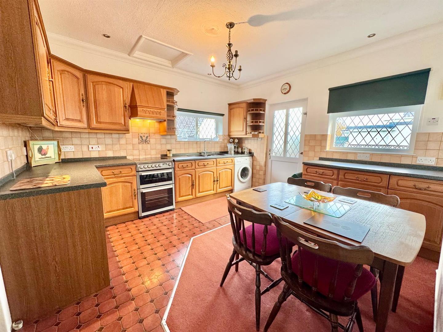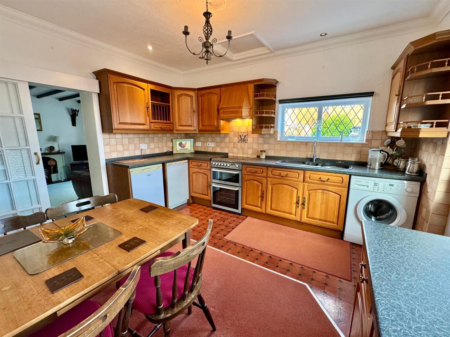 Fitted range of base and wall units with complimentary worktops; electric cooker point; filter canopy extractor hood above; single drainer sink with mixer tap; plumbing for automatic washing machine; radiator; UPVC double glazed windows overlooking side and rear elevation; UPVC door leading to outside rear.