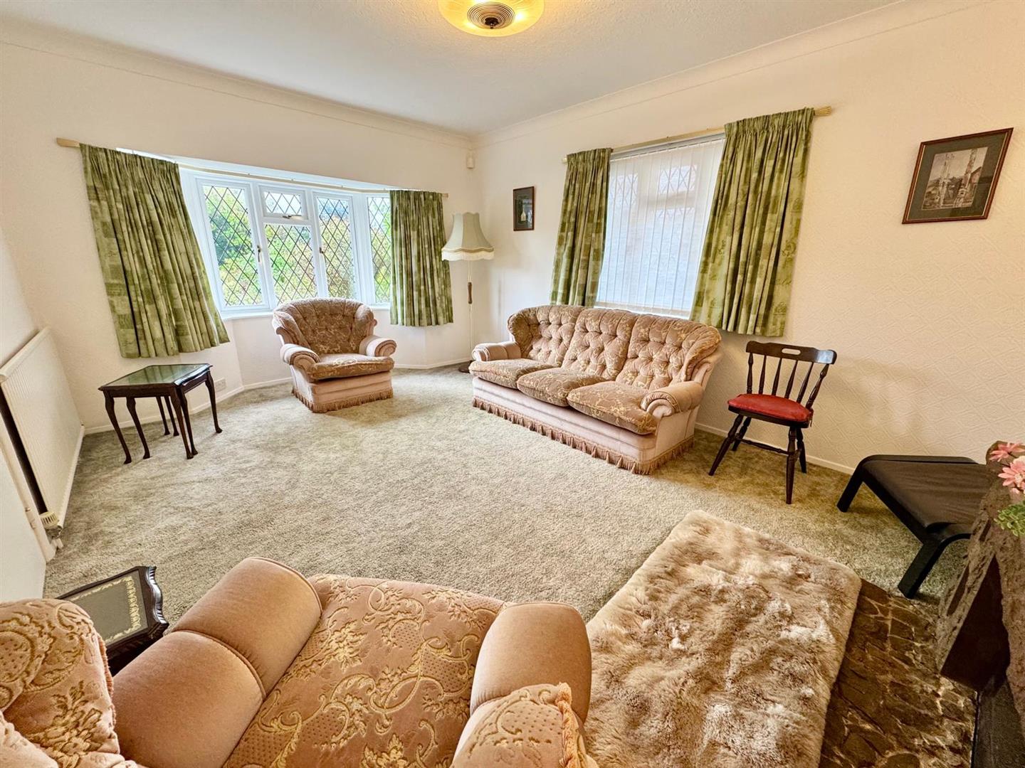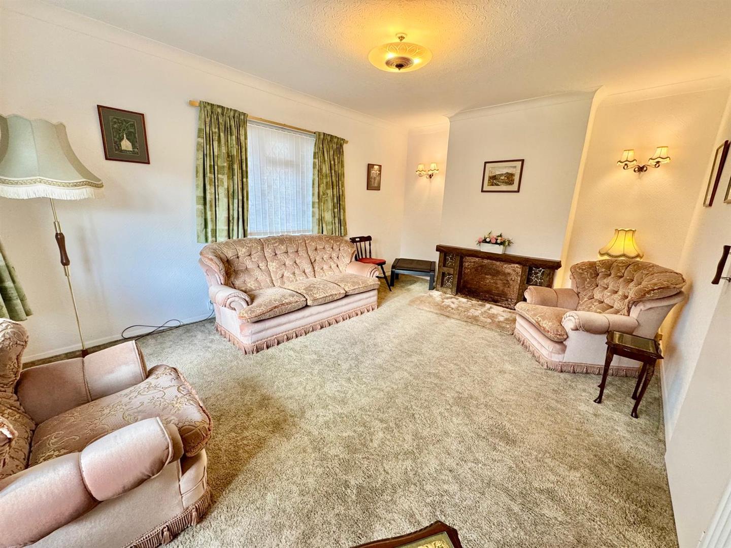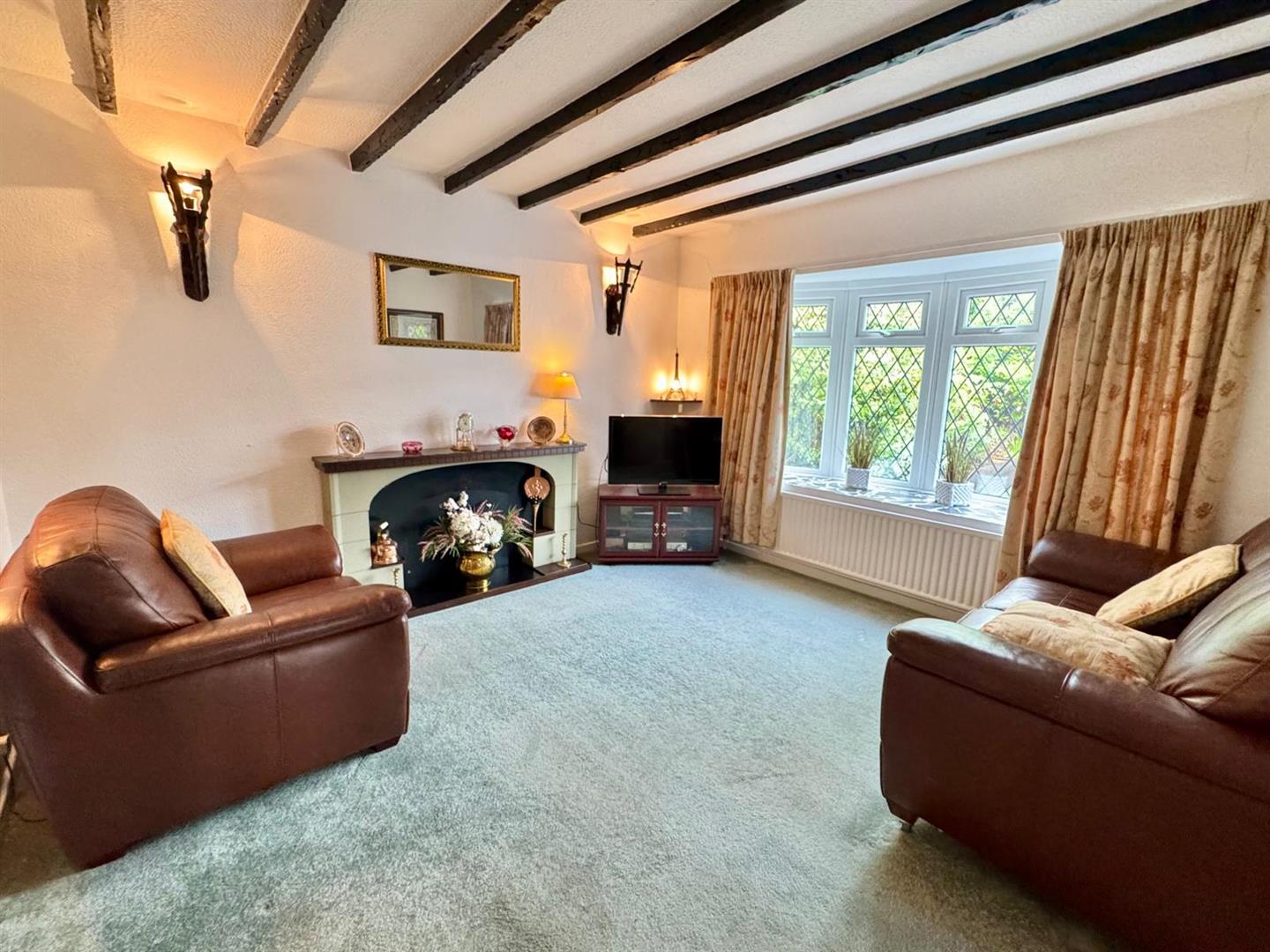 Attractive UPVC double leaded bay window overlooking front of property enjoying open aspect; feature fireplace surround ; wall lights; radiator; t.v point.