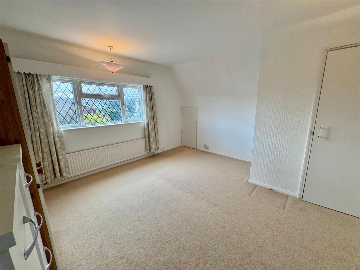 Spacious room with UPVC double glazed window overlooking front enjoying open aspect; radiator; large built in walk in wardrobe with shelving; recessed roof space storage areas providing ample storage room; built in wardrobes with high level storage. cupboard.