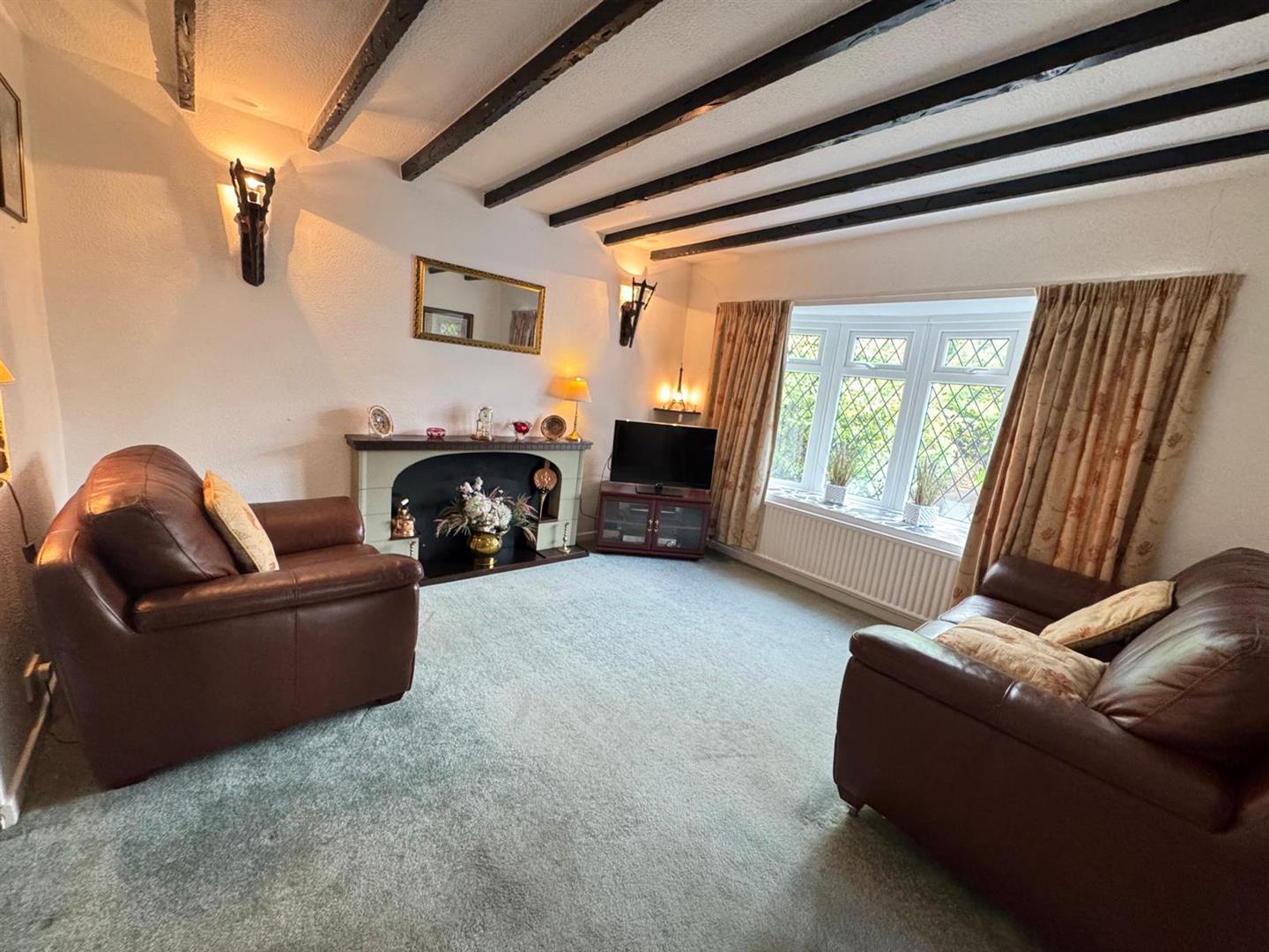 Feature fireplace surround; mock beamed ceiling; wall lights; radiator; UPVC double glazed window overlooking rear of property.