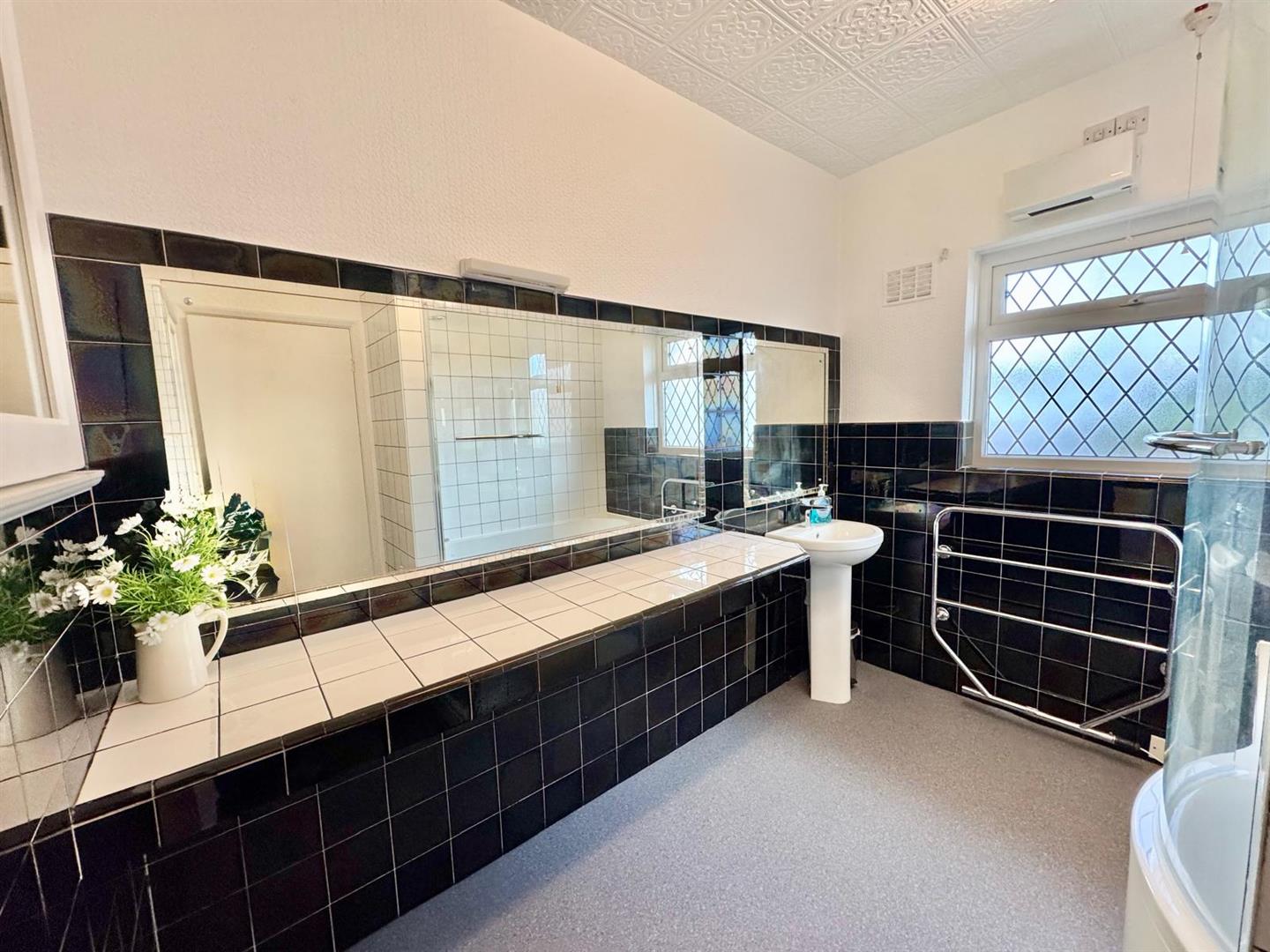 Double panel radiator; UPVC double glazed window overlooking rear of property; wash hand basin with splashback and mirror.