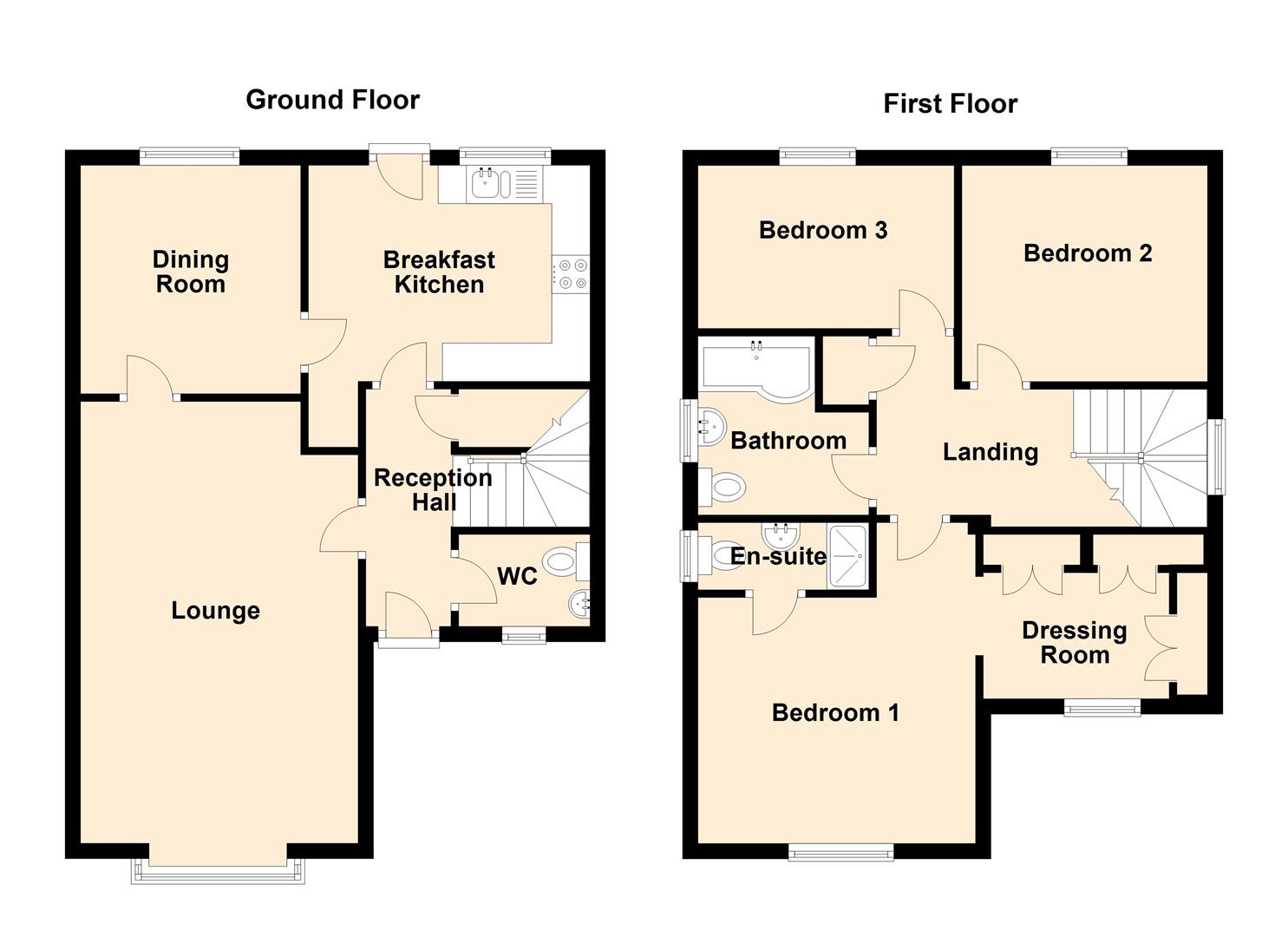 Accommodation in brief: Reception hall with cloakroom, staircase and storage; spacious lounge with feature fireplace; separate dining room; breakfast kitchen with access to rear garden. First floor landing leading to master bedroom with dressing area and en-suite shower room; two further bedrooms; family bathroom.