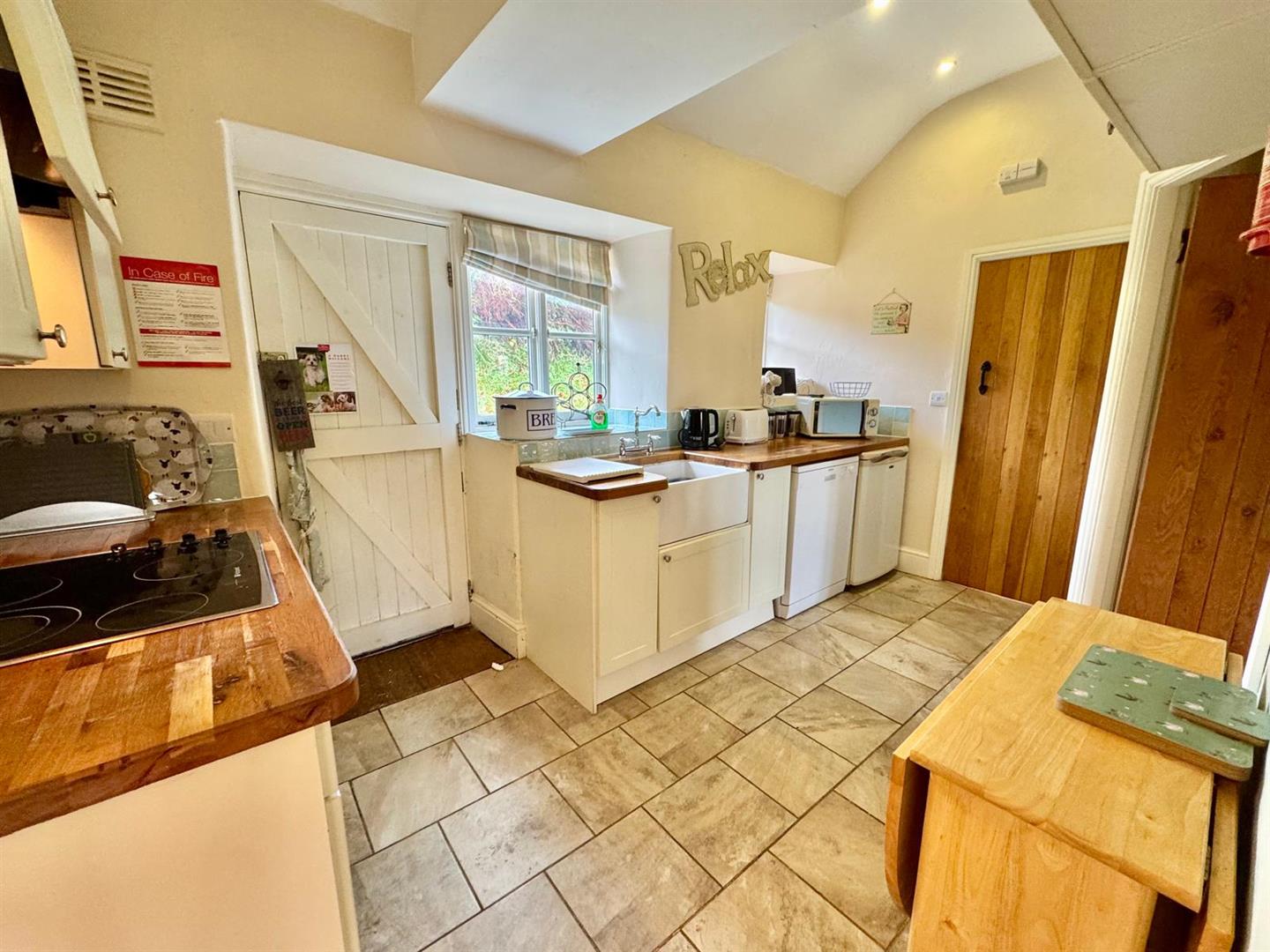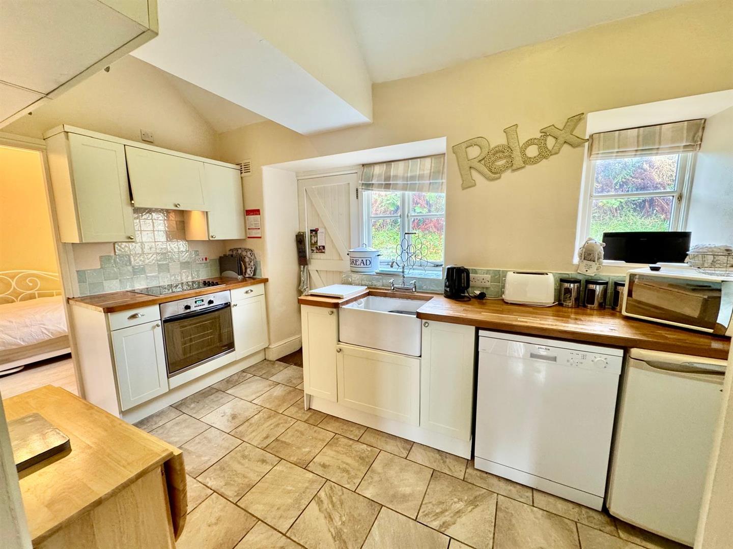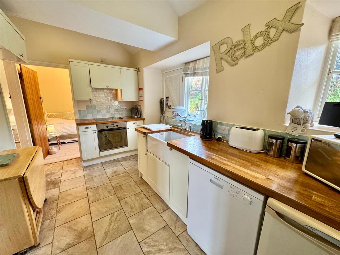 Fitted with a range of base and wall units with solid wood work surfaces incorporating inset Belfast-style sink, plumbing for dishwasher and space for fridge. Integrated stainless steel oven with four-plate ceramic hob and concealed filter extractor above. Double glazed window overlooking rear, timber rear door, floor tiling.