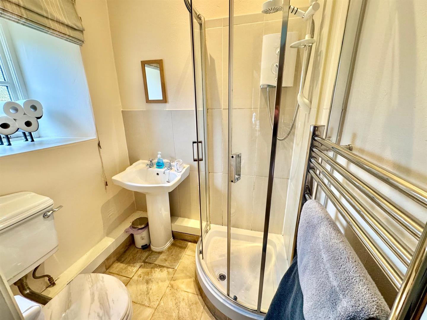 Three-piece suite comprising enclosed shower cubicle with electric shower, pedestal wash basin, low level WC, heated towel rail, double glazed window to rear, wall and floor tiling, extractor fan, spotlighting.